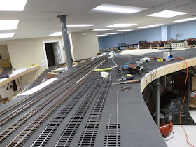 Here is a distance shot looking back into the yard with the branch high on the wall in the rear. The flow of the yard is nice but I am concerned about the coupling on a curve issue. There are plenty of curves in this yard. It looks like Clifton Forge on the C&O.