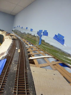Now we have to set the exact location and height of the main abutment for the other end of the bridge - that big concrete one you saw previously. It is going to barely fit inside of the main line. It has been suggested that I make a full scale template for the bridge. I think I need something more elaborate to help set the height as well. More on that later.