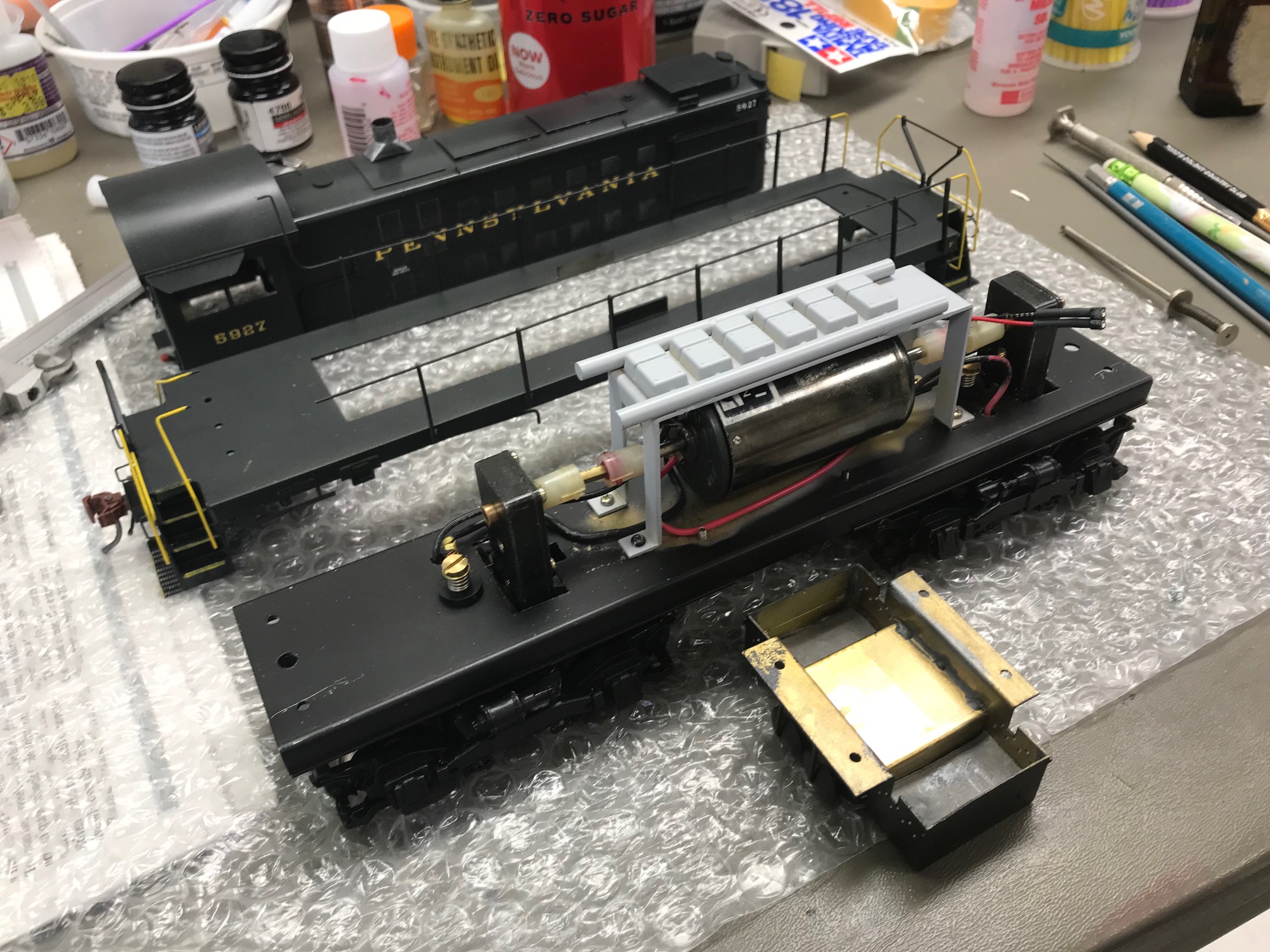 Next project is an Overland Alco S2 switcher that has been painted and had the lighting and crew added. It took me over two hours just to do the glass in the cab! When this model was produced, in 1985, Overland was adding simulated Prime movers. I painted it grey. It is an early end tower design and things are getting pretty tight under the hood!